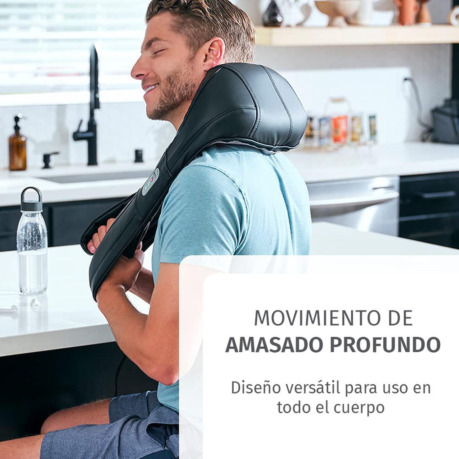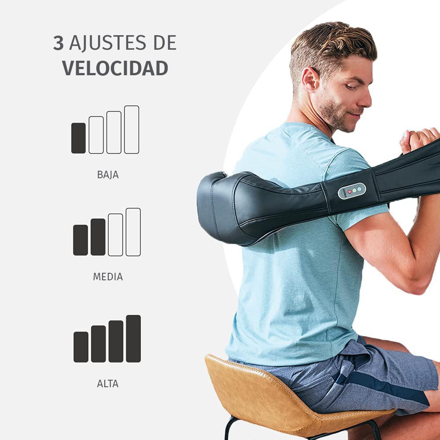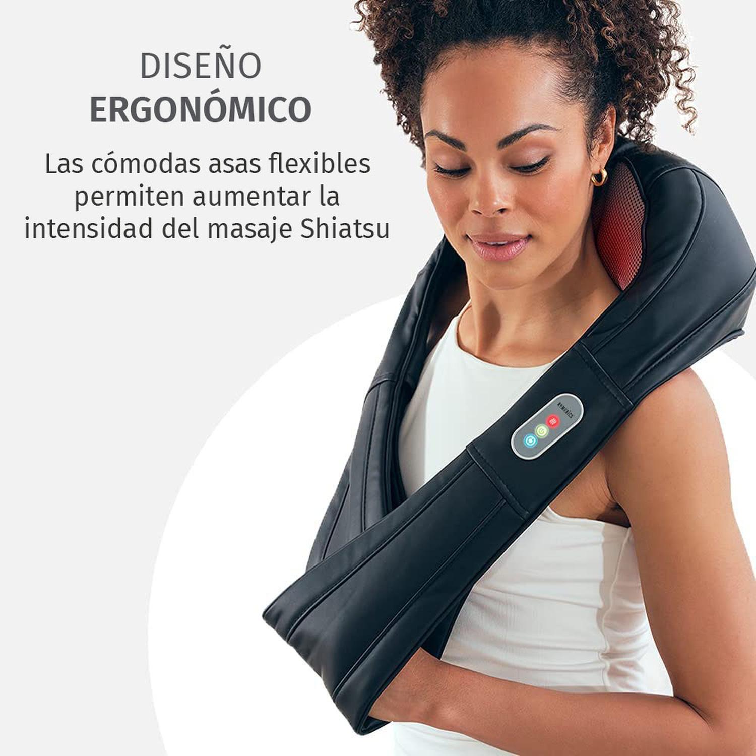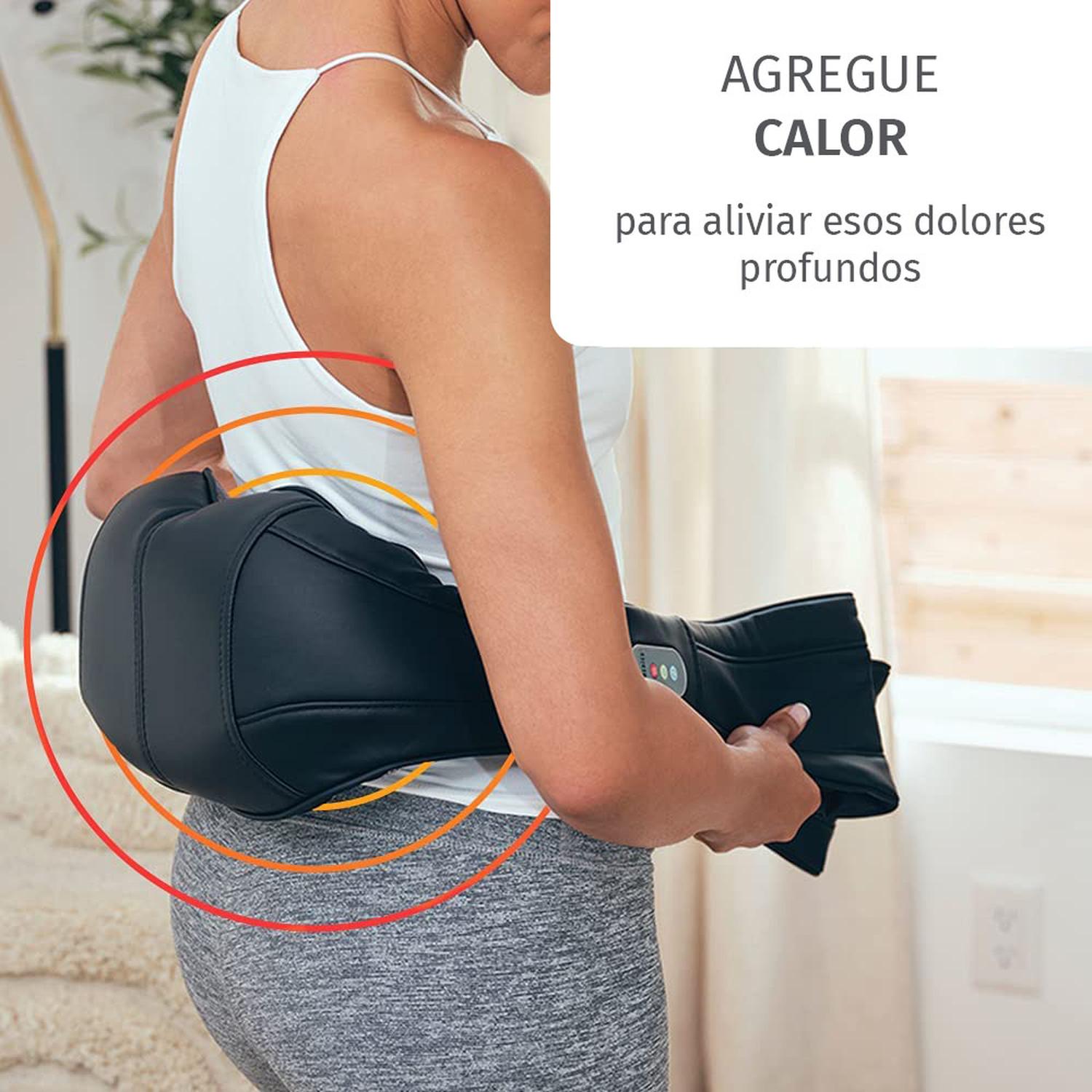 Imagina un masajista experto deshaciendo esa tensión justo donde lo necesitas. Este masajeador Shiatsu es tu alivio personal, diseñado con 4 nodos de acción dual (Quad Action) que amasan profundamente para liberar la rigidez, mientras el calor opcional penetra para disolver el estrés muscular. Con sus 3 niveles de intensidad y sus cómodas asas flexibles, tú tienes el control total de tu relajación.