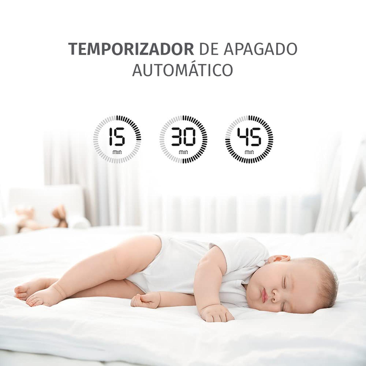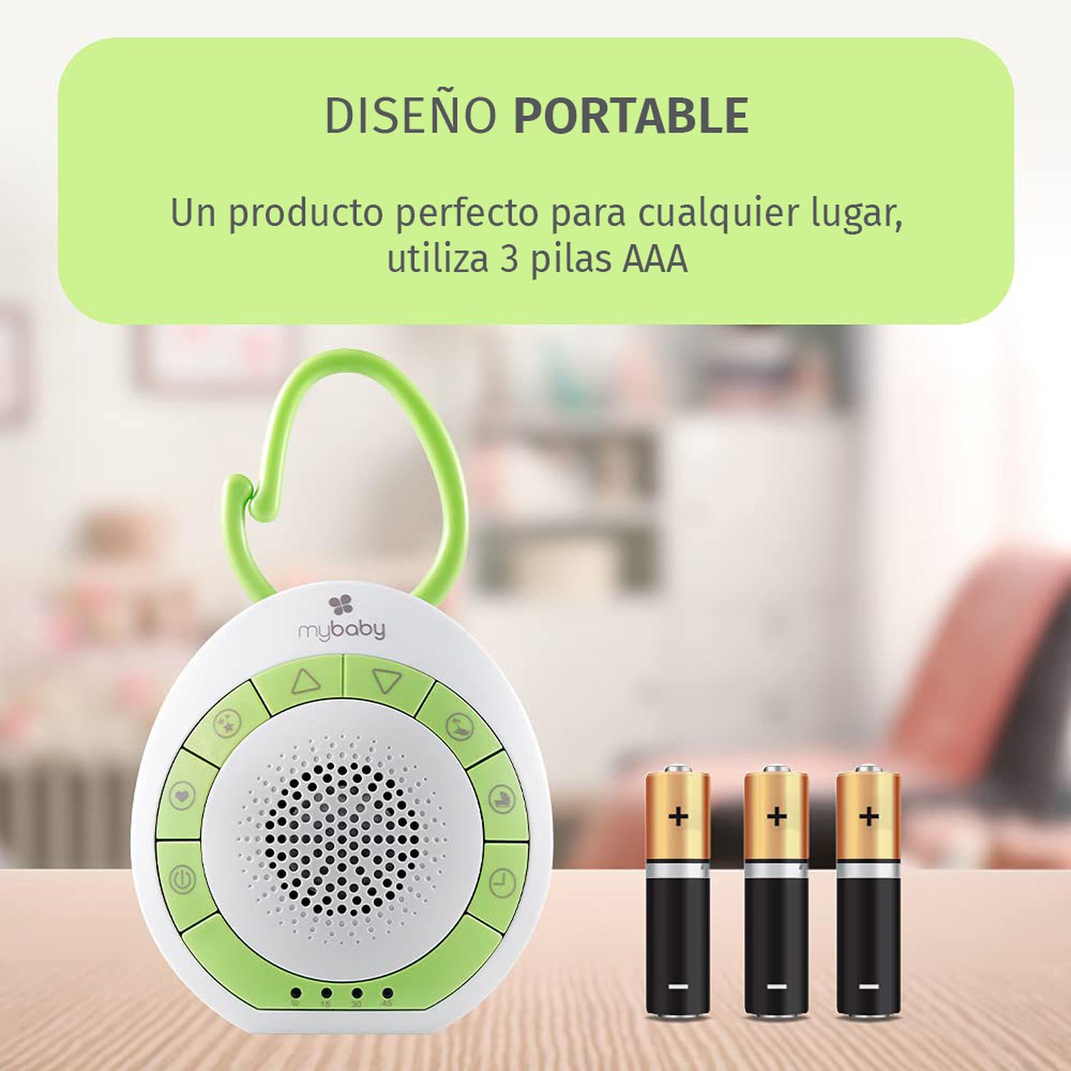 Su clip integrado se sujeta fácilmente donde lo necesites, y su temporizador de apagado automático (15, 30 o 45 minutos) ayuda a conservar la batería mientras tu bebé descansa.